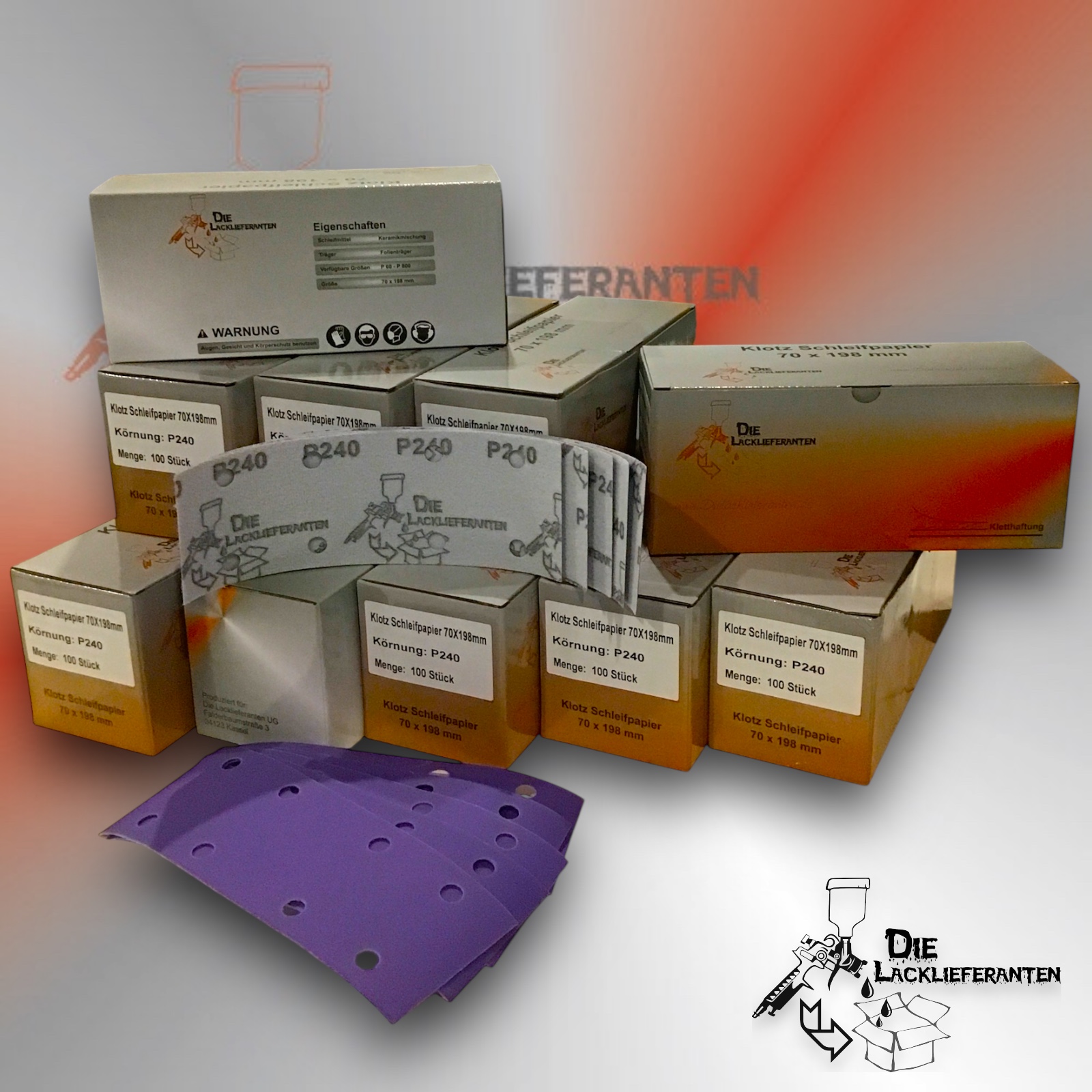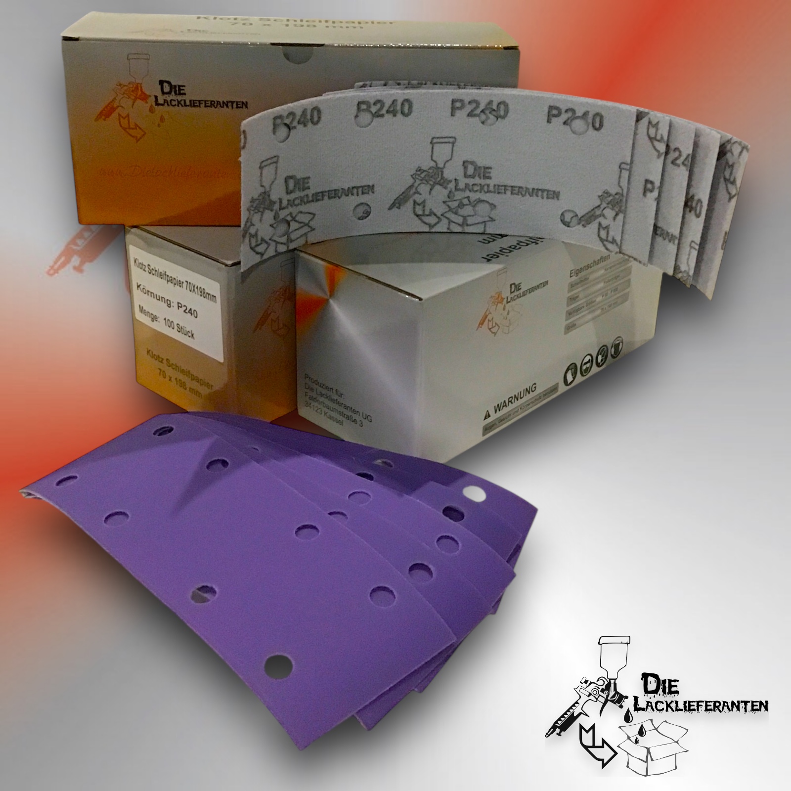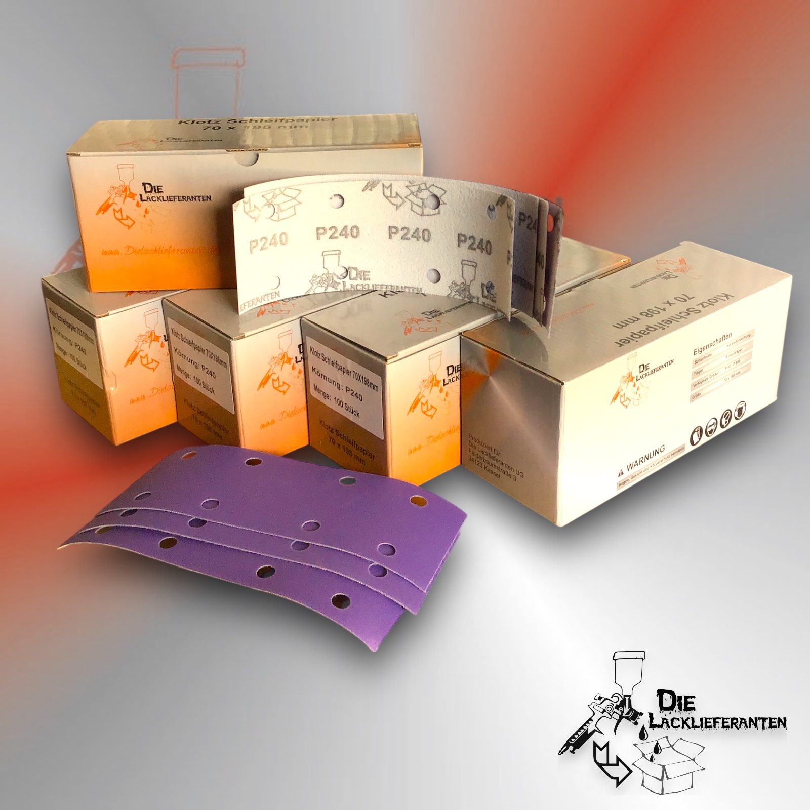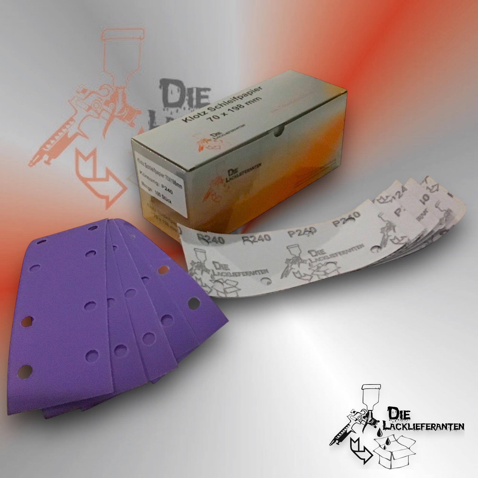 Zzgl. 20% MwSt.zzgl. Versand100X Klotz Schleifpapier / Klett-Schleifstreifen P240 70x198mm Folienträger, 8 Loch Absaugung, Schleifkorn Keramikmischung #Q22T70X198P240